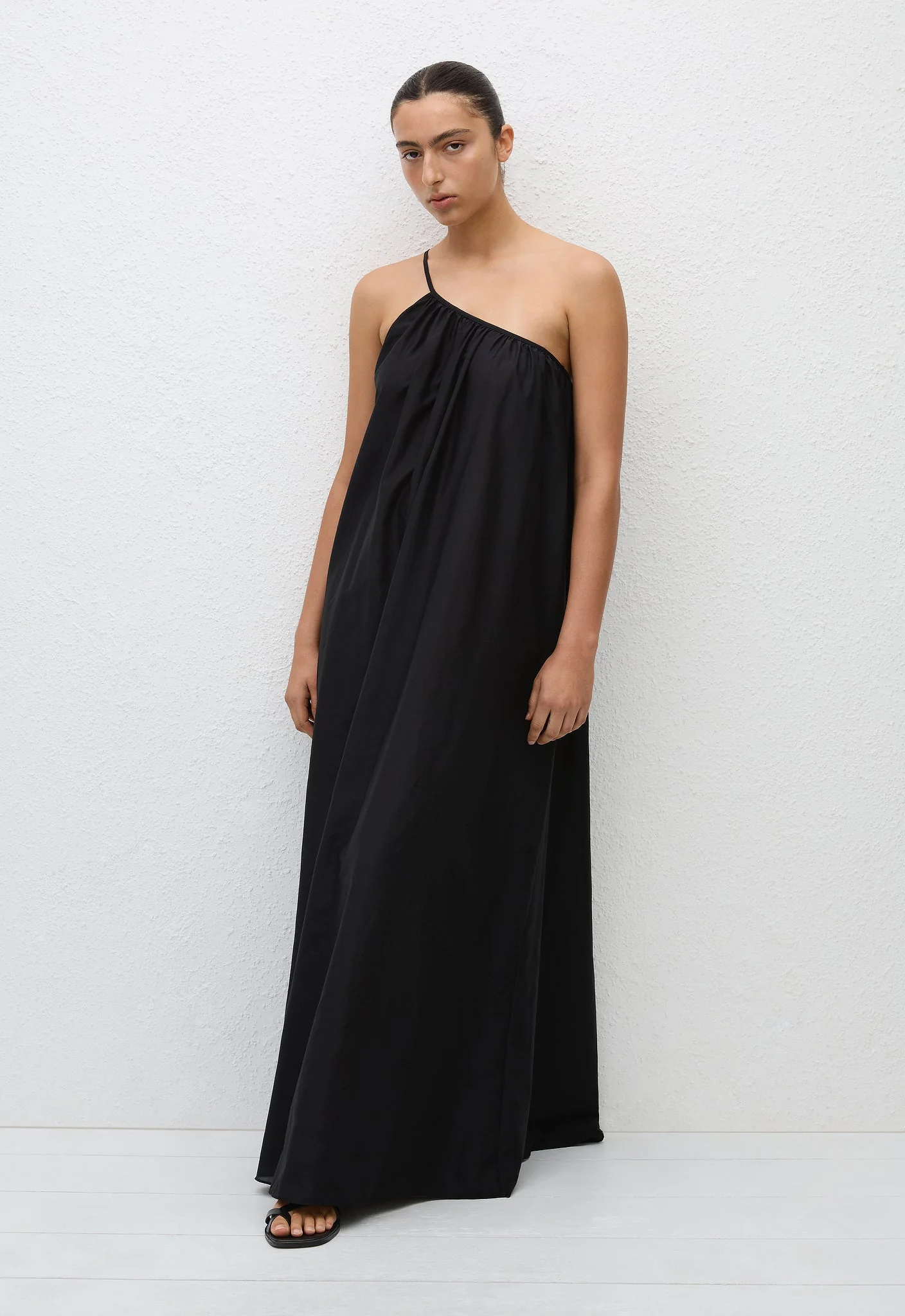 This one shoulder pull-on maxi dress is effortlessly elegant. It features a soft gathered asymmetric neckline which extends into a single strap, with inseam pockets at the hip for added ease. Crafted from our lightweight organic cotton-silk voile, this dress has an element of sheerness.